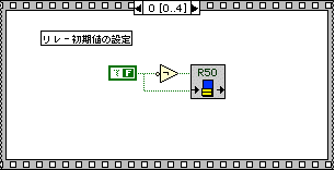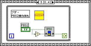 のように[R50]の出力を反転させてワイヤリングします。シーケンス0番で[R50]の出力はfalse"0"が保持されていますから,このシーケンスでは,フロントパネルのPBS1をクリックするまでループは実行を続けます。