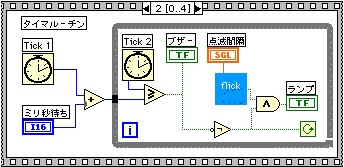 [Tick 1]はループ実行前に1回だけ実行され,フロンとパネルの制御器[ミリ秒待ち]に入力されたタイマー設定時間のカウントと加算した値を[Tick 2]のカウントが越えるまでループが実行されます。