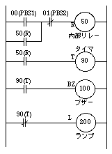 の様になります。このラダーチャートは,内部リレー(R50)の2個のリレースイッチ50(R)と2個のタイマスイッチを使用します。
